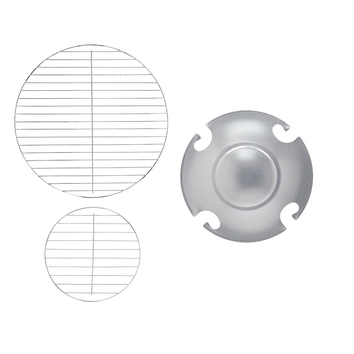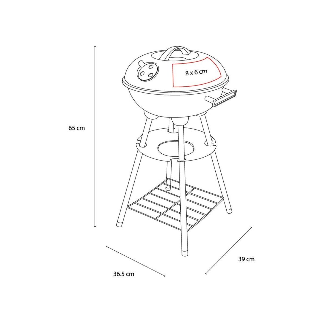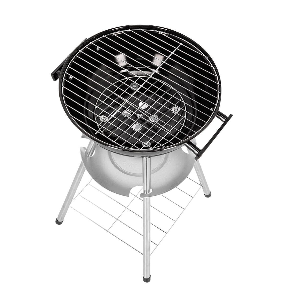 Asador portátil de carbón. Incluye parrilla de cocción en acero inoxidable, patas y recolector de cenizas fáciles de quitar, tapa con difusor de temperatura y agarradera fría al tacto en tapa.