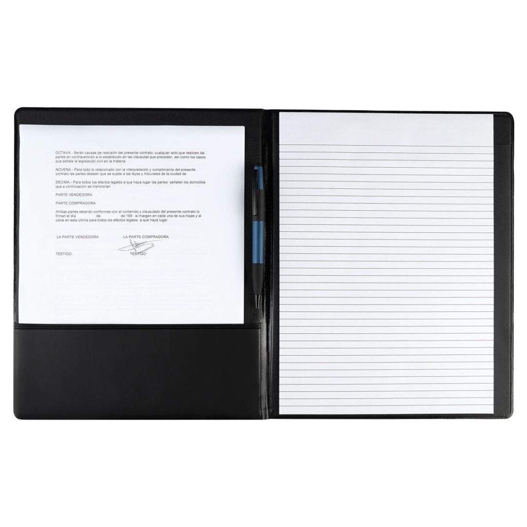 Incluye block de raya tamaño A4 con 20 hojas, espacio para bolígrafo y compartimento para documentos. No incluye bolígrafo.
