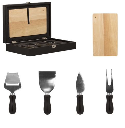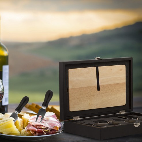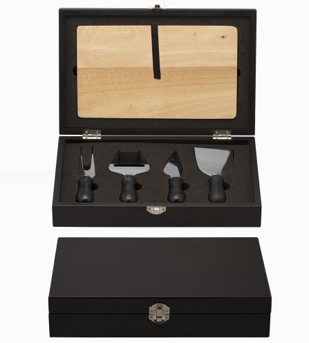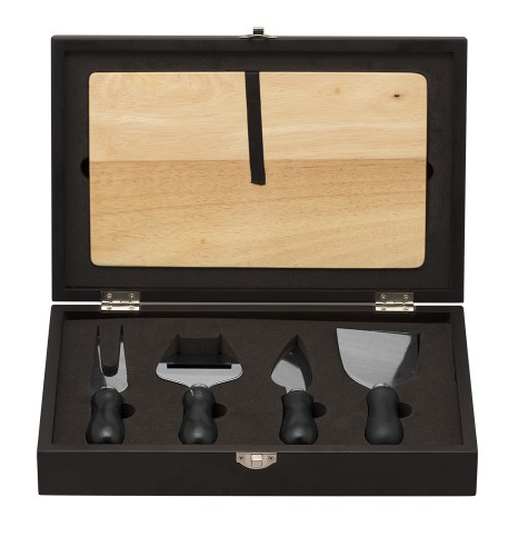 Set corta quesos de 5 unidades. Incluye: Tabla, 2 palas, 1 cuchillo y 1 tenedor, en estuche de madera.