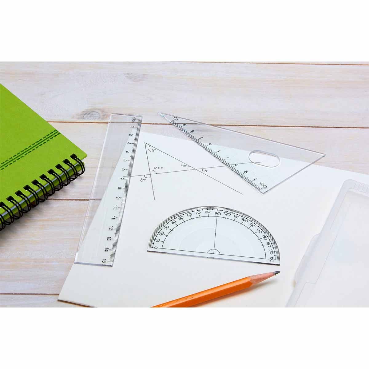 Incluye regla, transportador y escuadra.