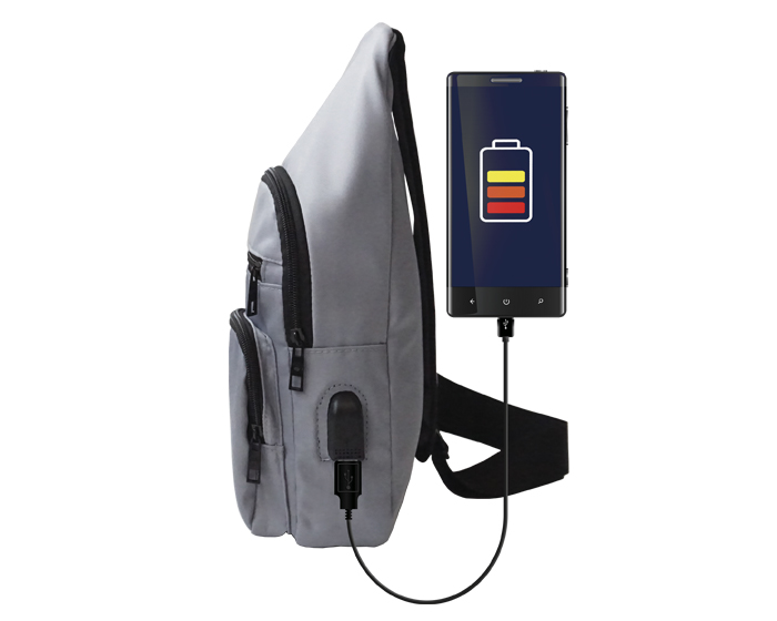 Está fabricada en poliéster resistente con acabado impermeable. Por eso, protege tus pertenencias contra lluvia ligera o salpicaduras. Además, cuenta con puerto USB y cable incluido. De esta forma, puedes cargar tu celular fácilmente con una batería auxiliar (no incluida) mientras te desplazas.