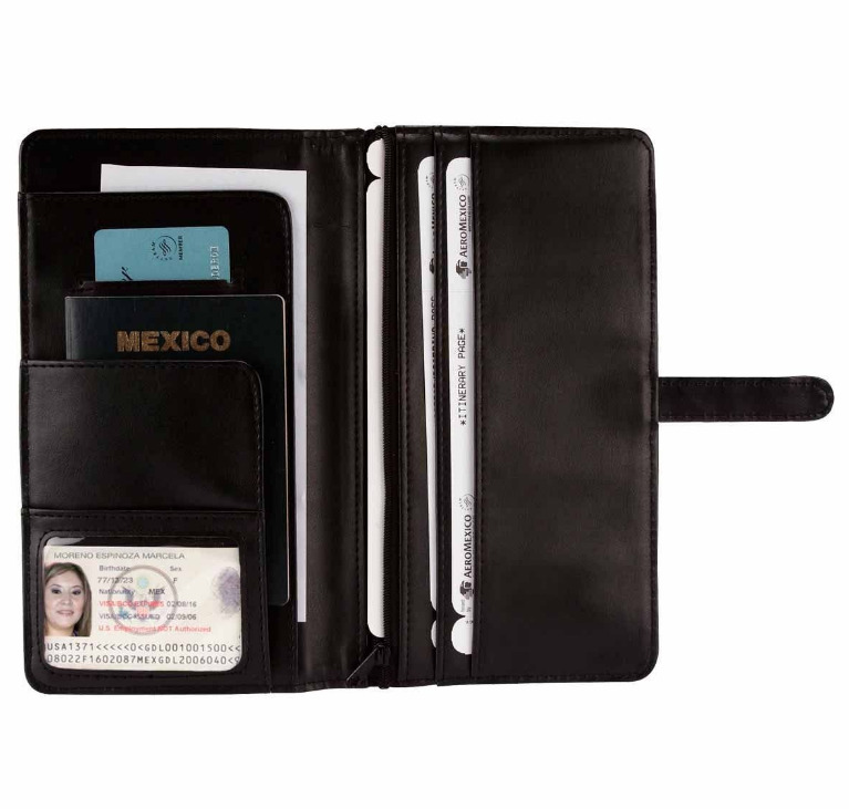 El porta pasaporte es sin duda lo mejor para guardar todos tus documentos importantes para tu viaje tiene espacios para el boleto, tarjetas  y visa