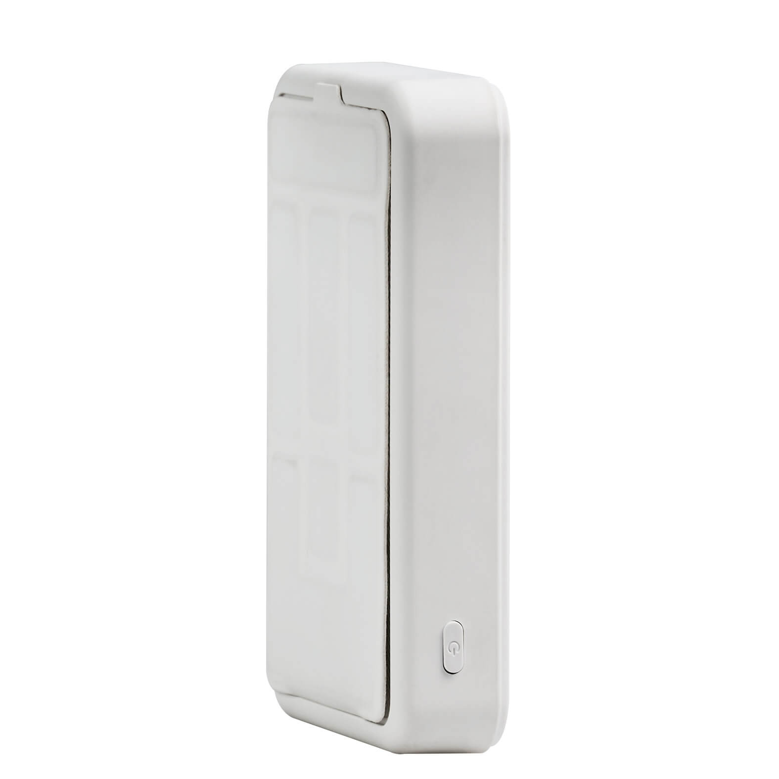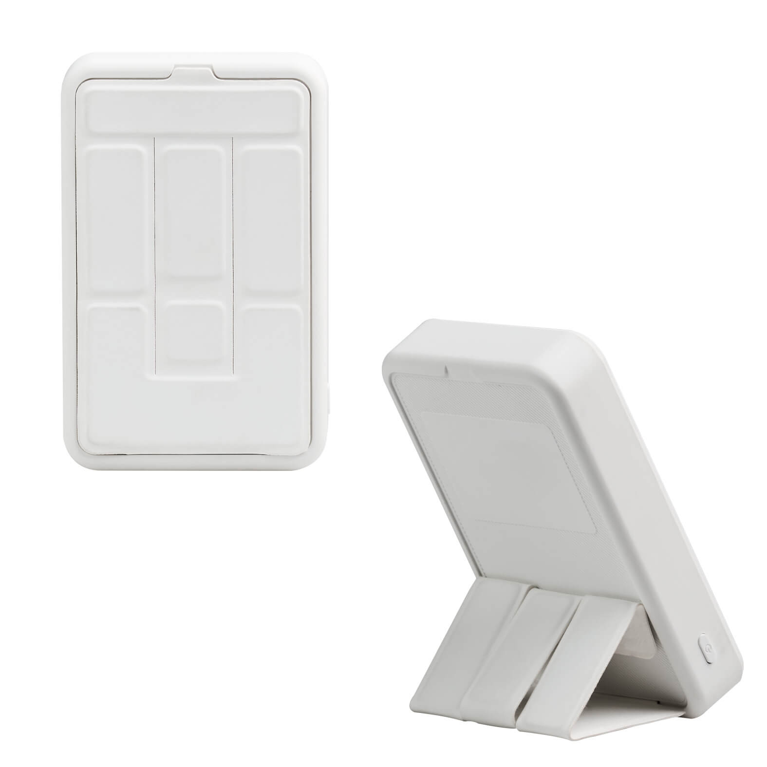 Power Bank inalámbrico de 10,000 mAh con acabado rubber y soporte plegable. Cuenta con una entrada USB, una Micro USB, una Tipo C y una Lightning.