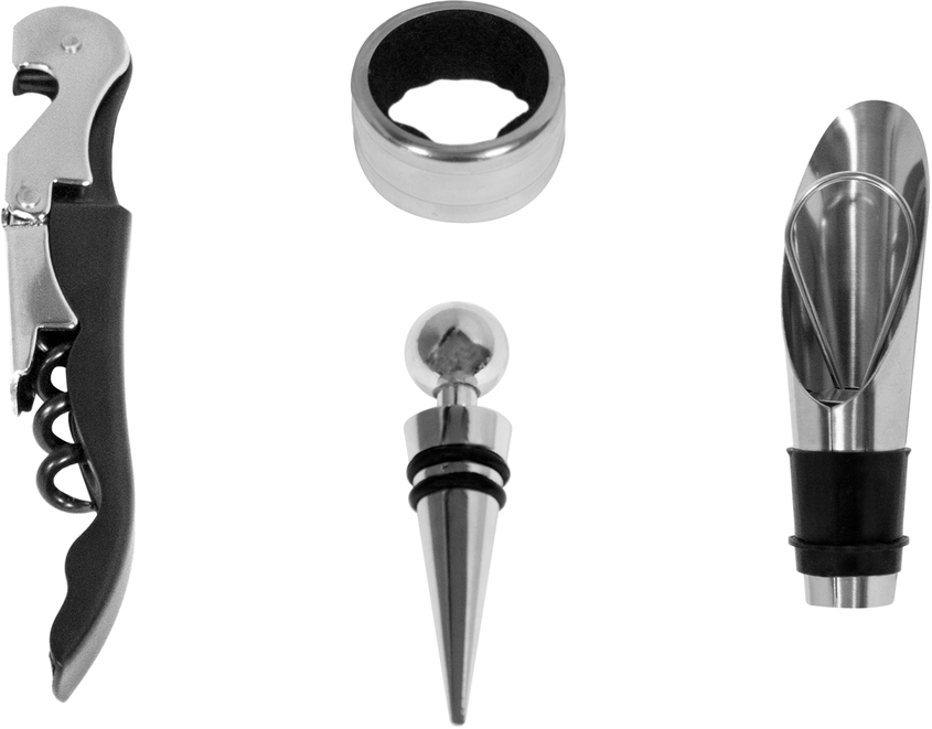 INCLUYE: SACACORCHOS, ANILLO, VERTEDOR Y TAPON
