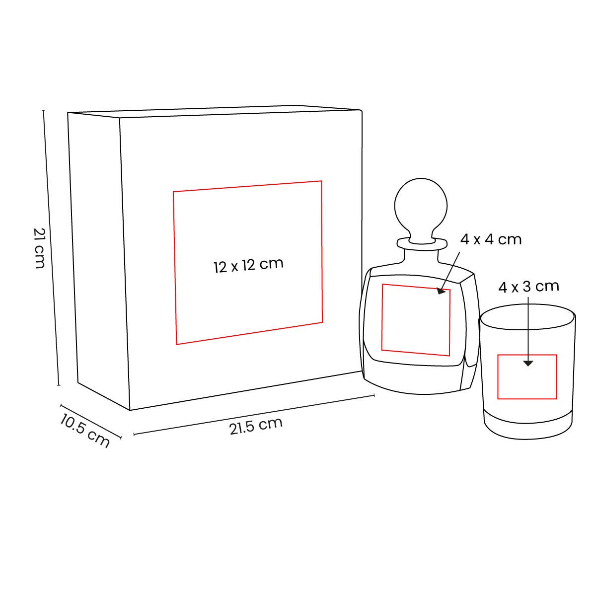 Área4 x 4 cm Licorera / 4 x 3 cm Vaso / 12 x 12 cm Caja
