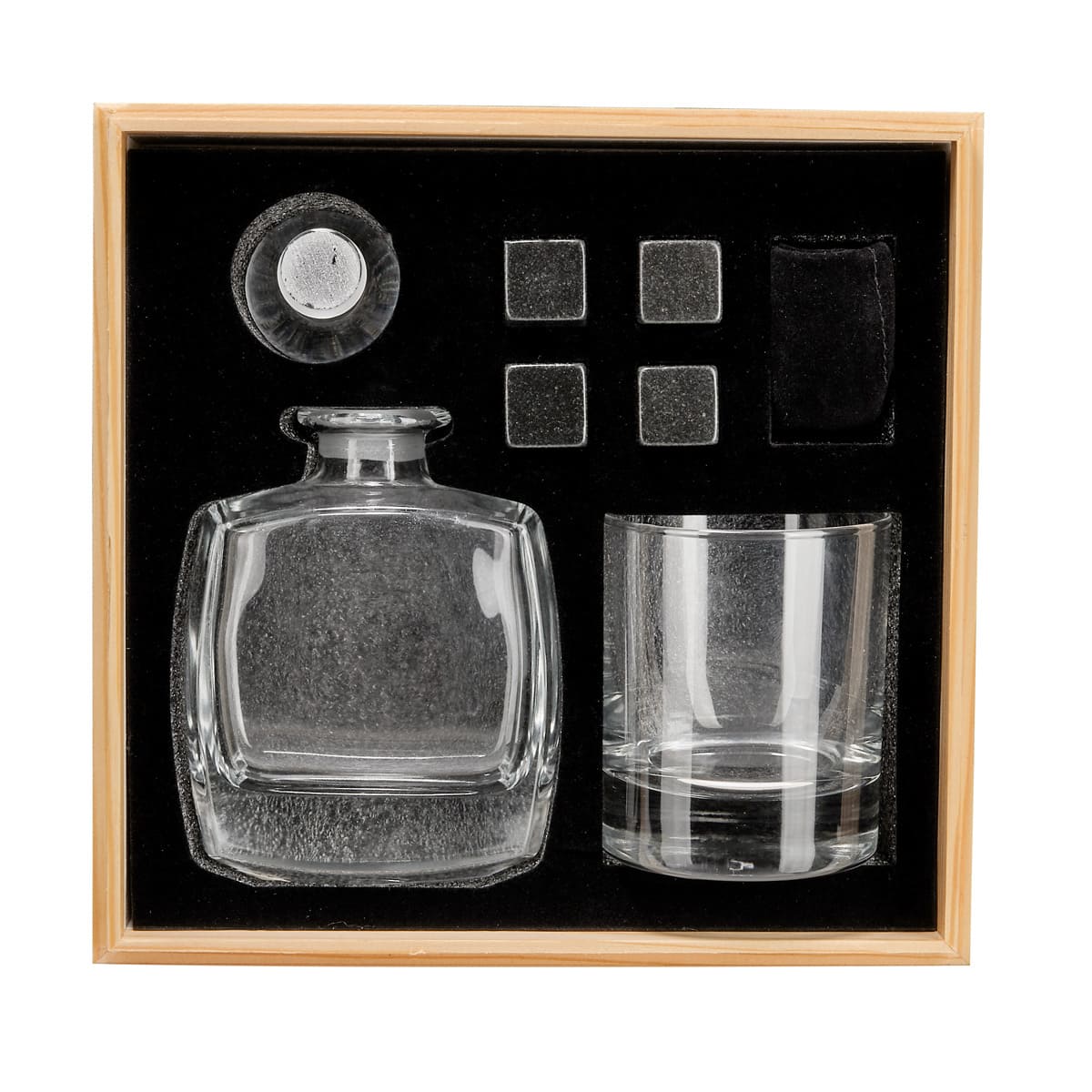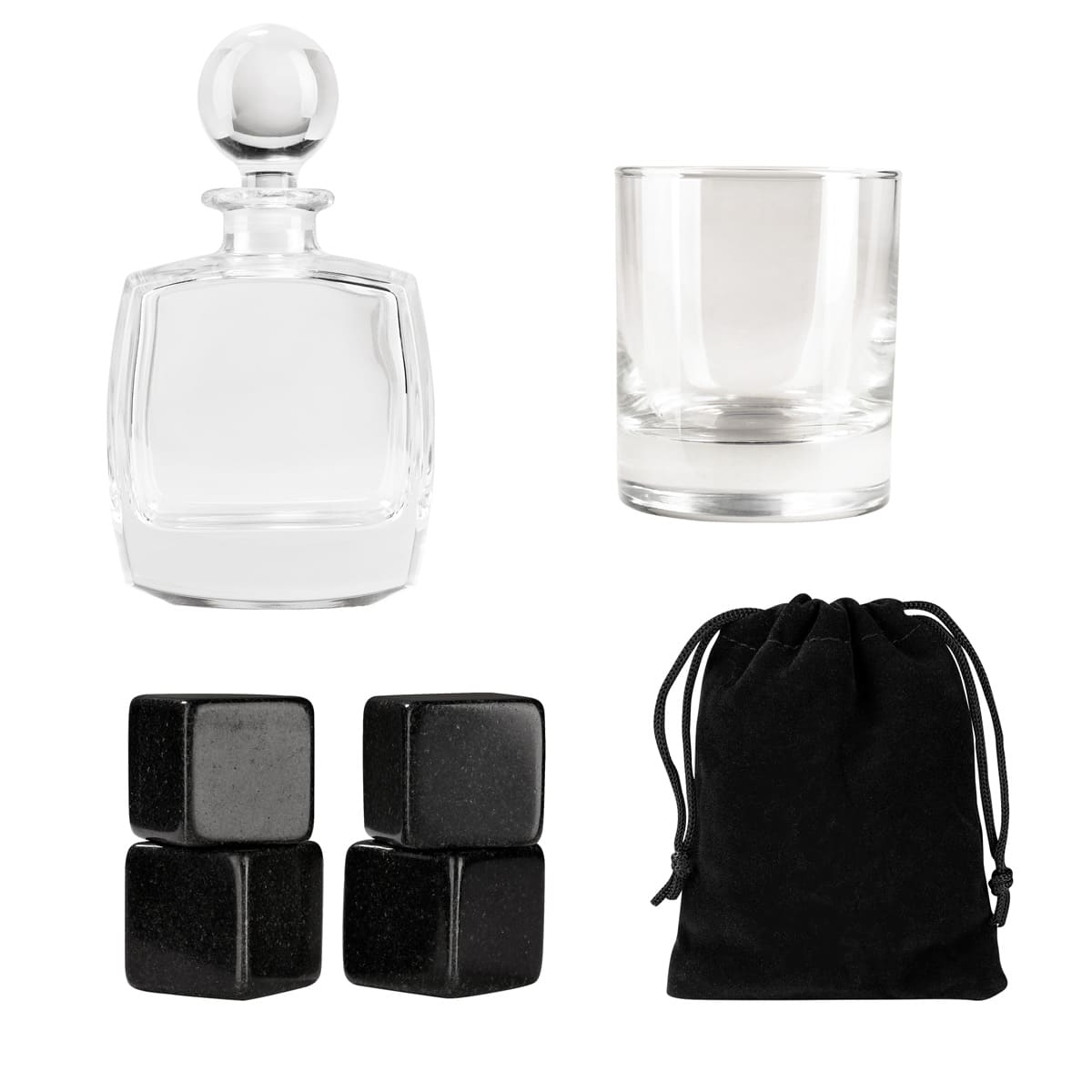 Set de bar. Incluye licorera, vaso de cristal, 4 enfriadores de piedra, bolsa de terciopelo con cierre de jareta y estuche de madera.
