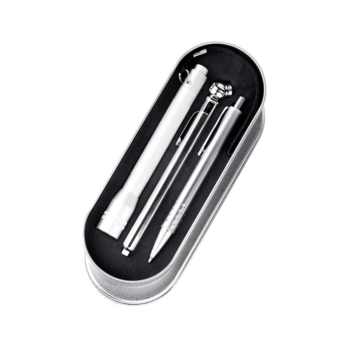 Set de lampara y calibrador sin duda algo diferente para promover tu marca ademas tiene pluma y estuche metalico