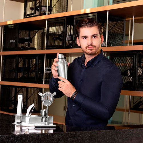 Descripción: SET SKOPJE (Set para preparación de bebidas con base. Incluye shaker, pinzas, sacacorchos, dosificador, colador y cuchillo.)