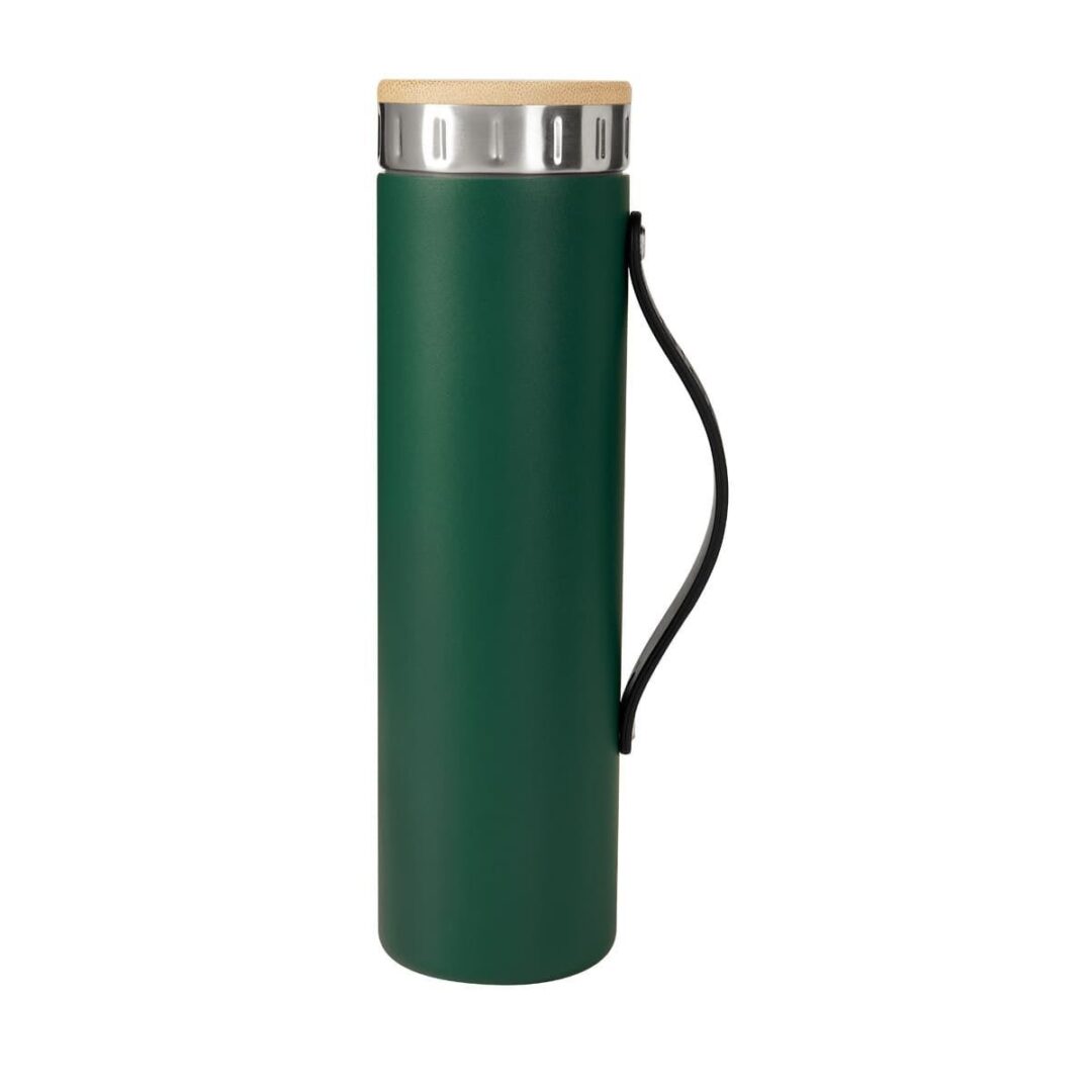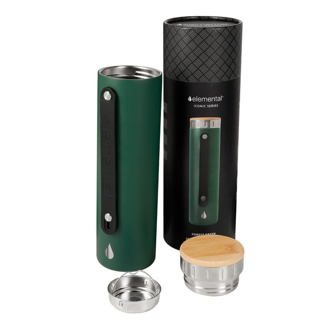 Tecnología TrueBarrier™ que usa aislamiento de triple pared. Doble pared de acero inoxidable y una capa de revestimiento de cobre. Cerrado al vacío. Material BPA free. Tapa de bambú. Contiene filtro de acero inoxidable. Banda de silicón ajustable y removible. Terminado rugoso. Base antiderrapante. Mantiene temperatura caliente 12 hrs y fría 24 hrs aproximadamente. Incluye caja individual.