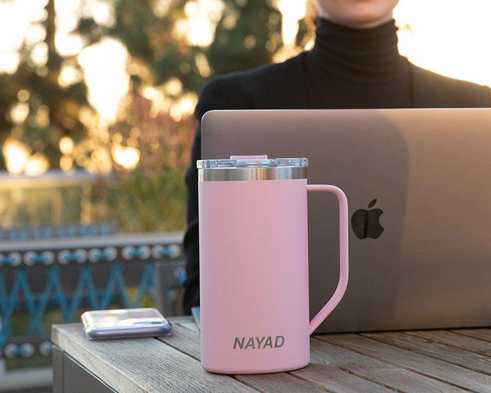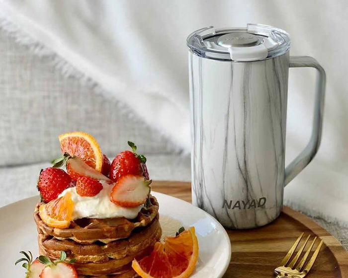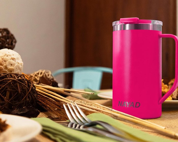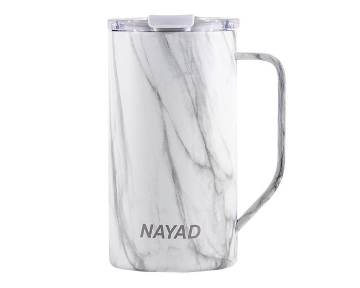 Tarro térmico de doble pared marca NAYAD de acero inoxidable 304 insulado al alto vacío, cuenta con capa interior de cobre que permite mantener las bebidas frías por 20 horas y calientes por 10 horas. Cubierta metálica con acabado de polvo plástico, asa ergonómica para un agarre más firme. Incluye tapa de tritán con cierre a presión, detalle metálico en el centro y tapón abatible que permite beber fácilmente sin derrames. CAP. 591 ml. Presentación: Caja de color.