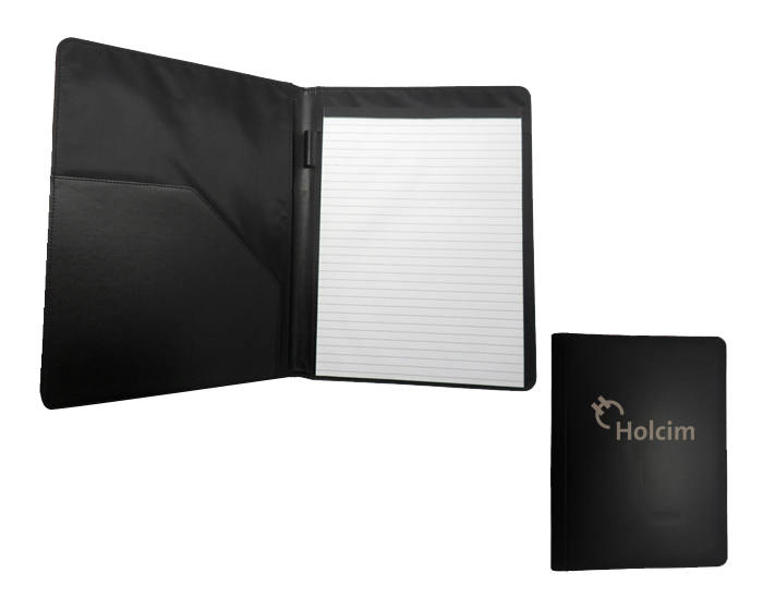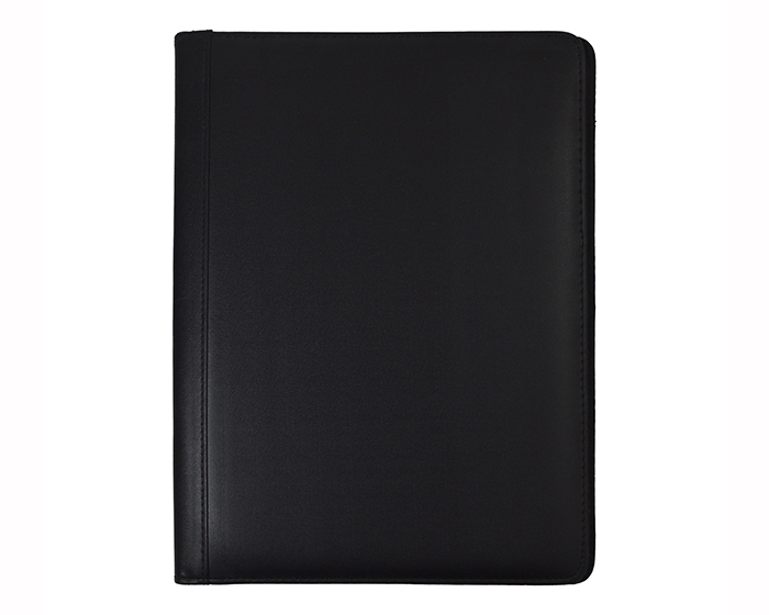 Carpeta de curpiel tamaño carta con block de 20 hojas rayadas, compartimento lateral para papeles y documentos.